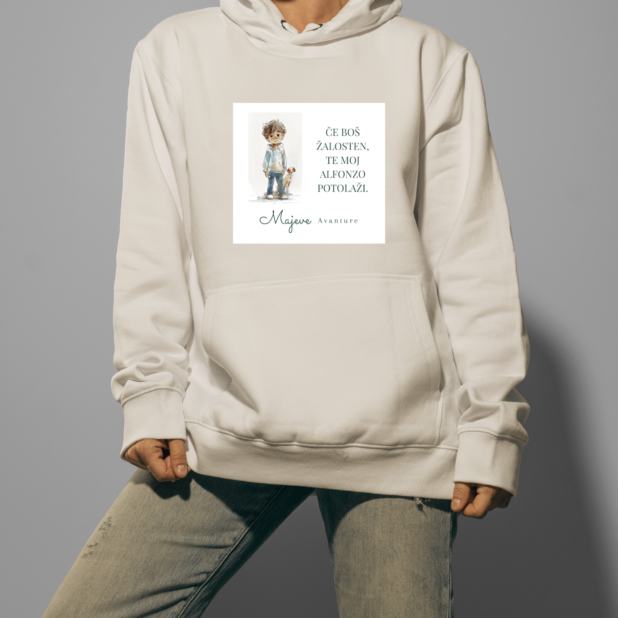 Unisex kapucar z logotipom Majevih avantur je udoben, topel in primeren za vsakdan.